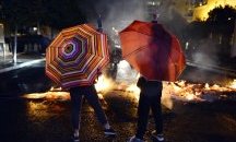 Участници в протестите започнаха да хвърлят камъни и метални пръчки по полицейския кордон.